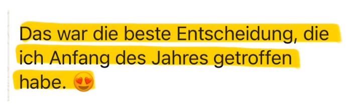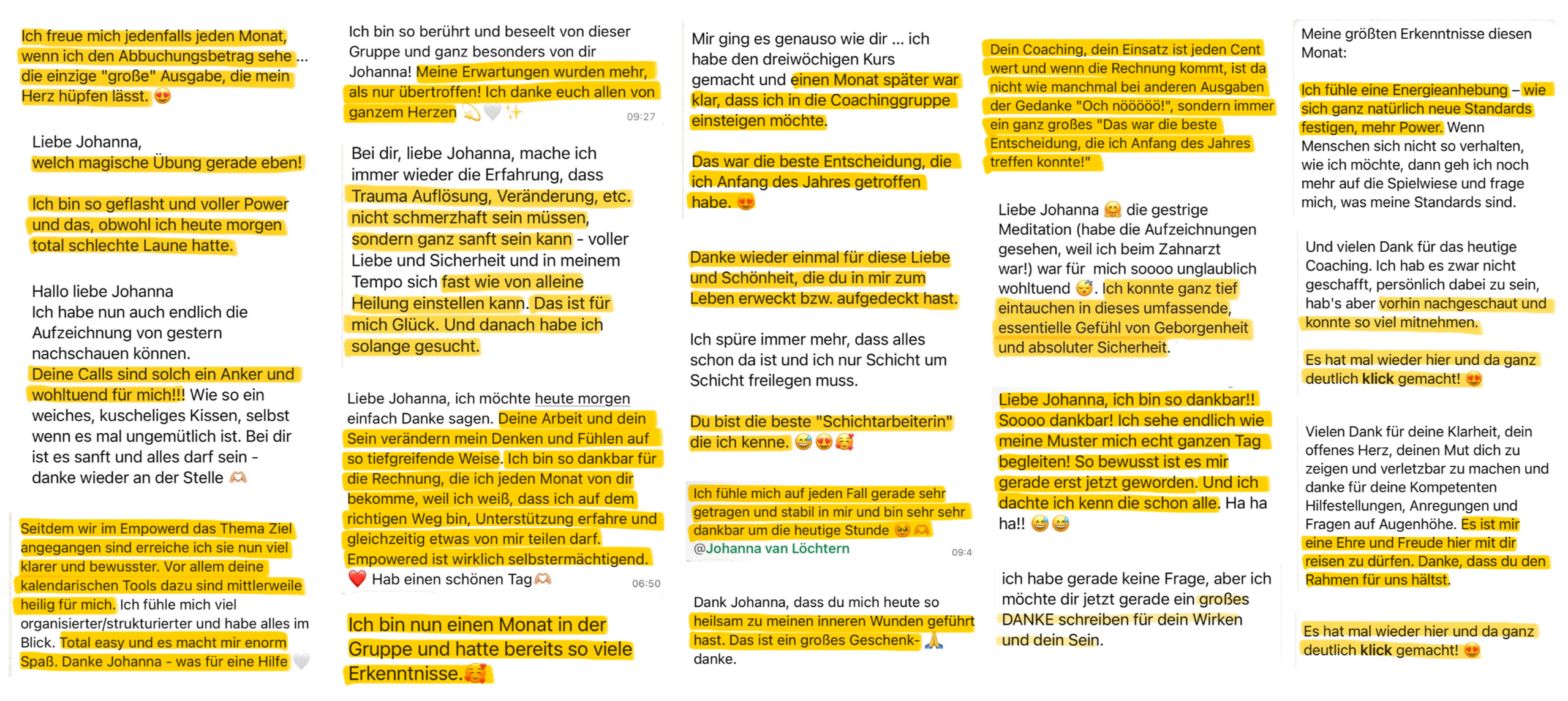 Ein klassisches Workbook gibt es in EMPOWERED bewusst nicht. Du wirst darin bestärkt, deine eigenen Notizen zu machen und genau das mitzunehmen, was für dich persönlich wesentlich ist. Reflexionsfragen und vertiefende Inhalte stellt Johanna dir direkt im Chat zur Verfügung – und zusätzlich nochmals in der WhatsApp-Gruppe, sodass du jederzeit darauf zugreifen kannst.